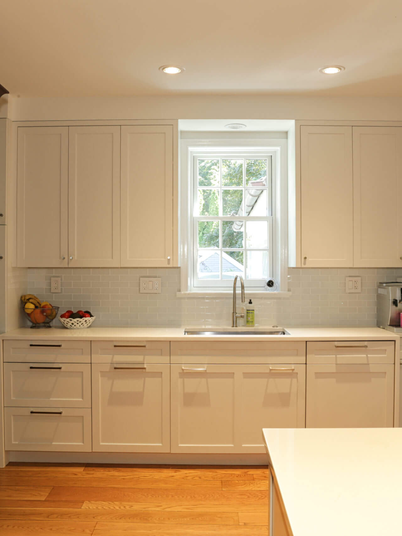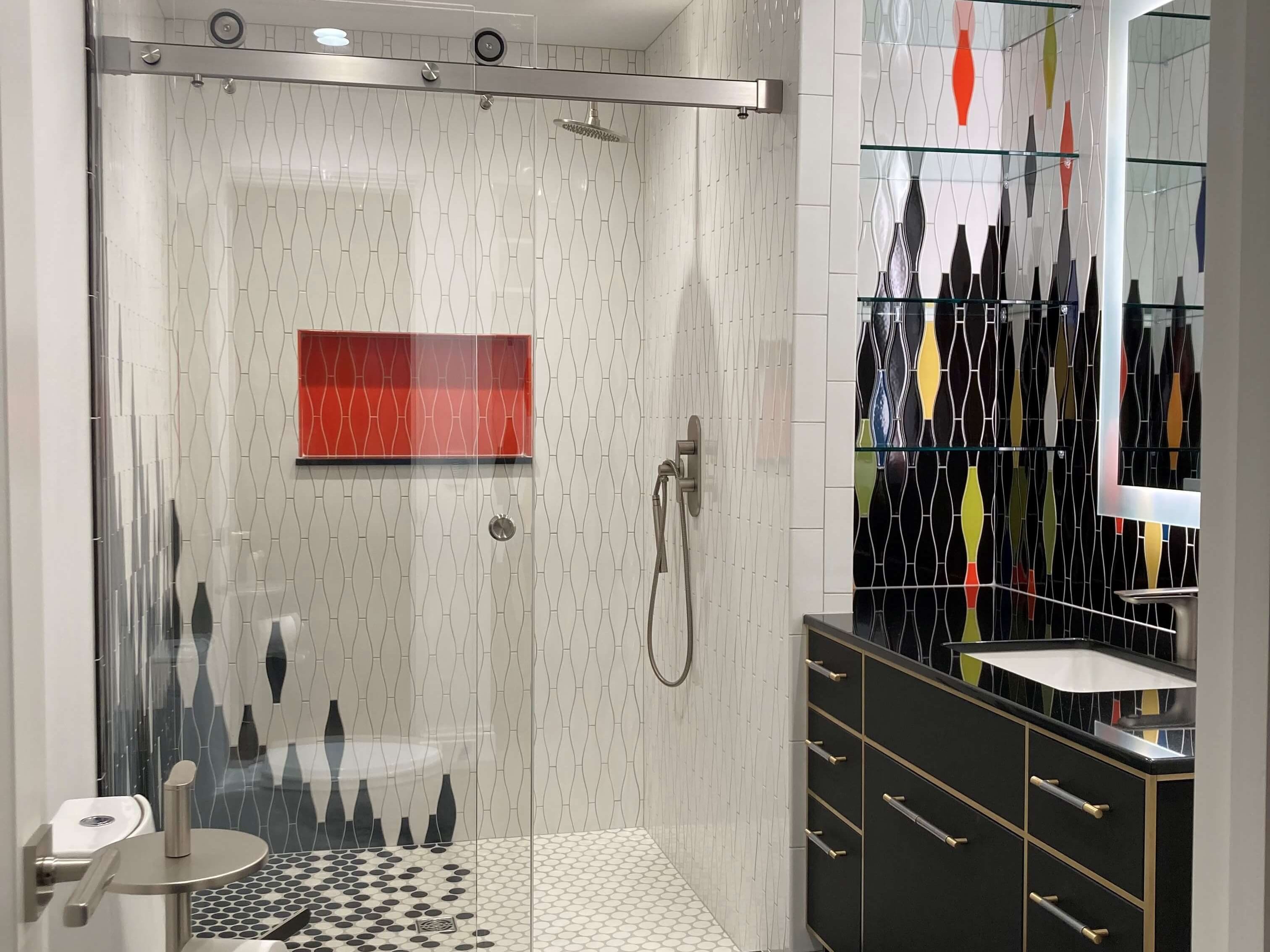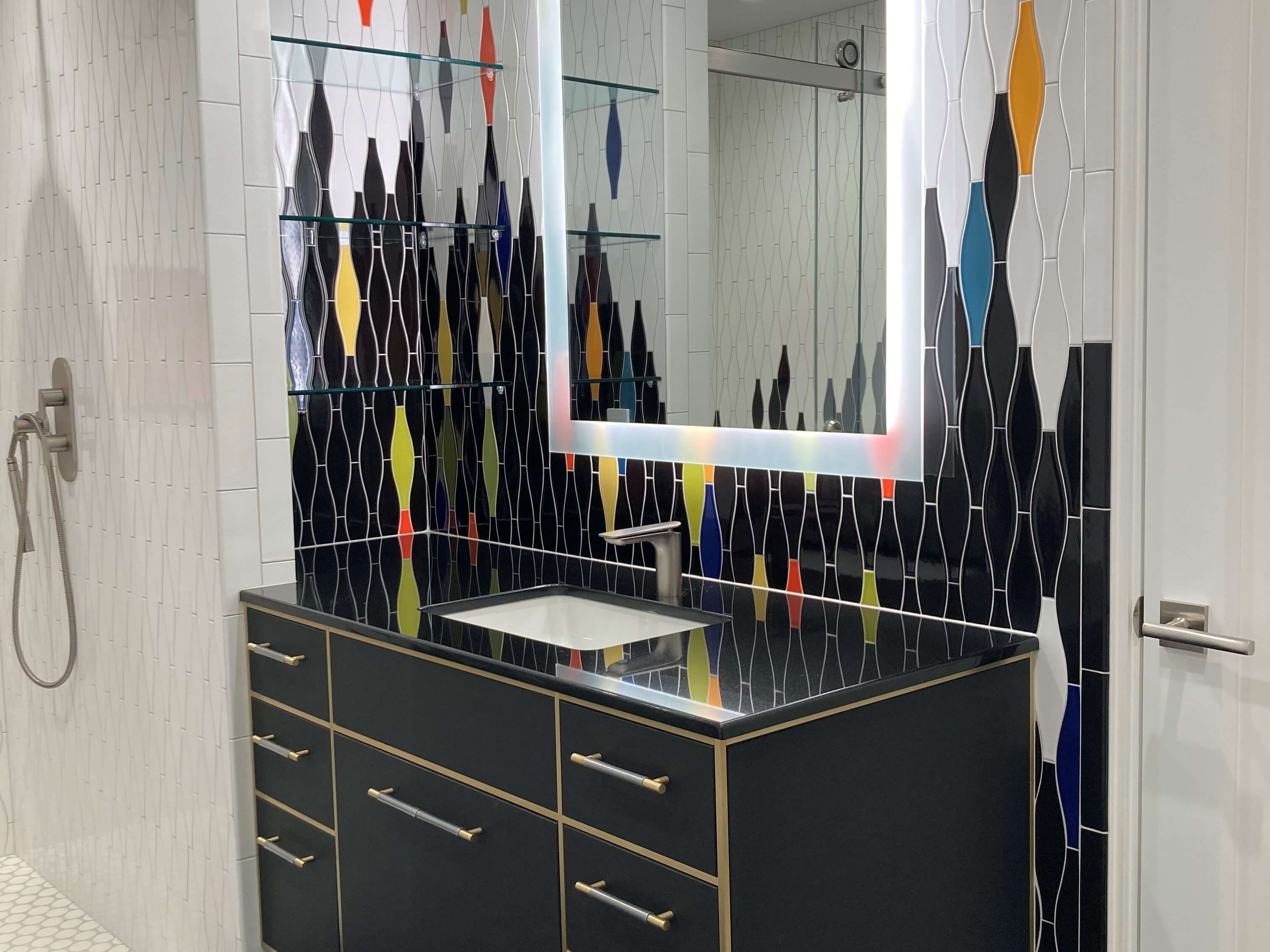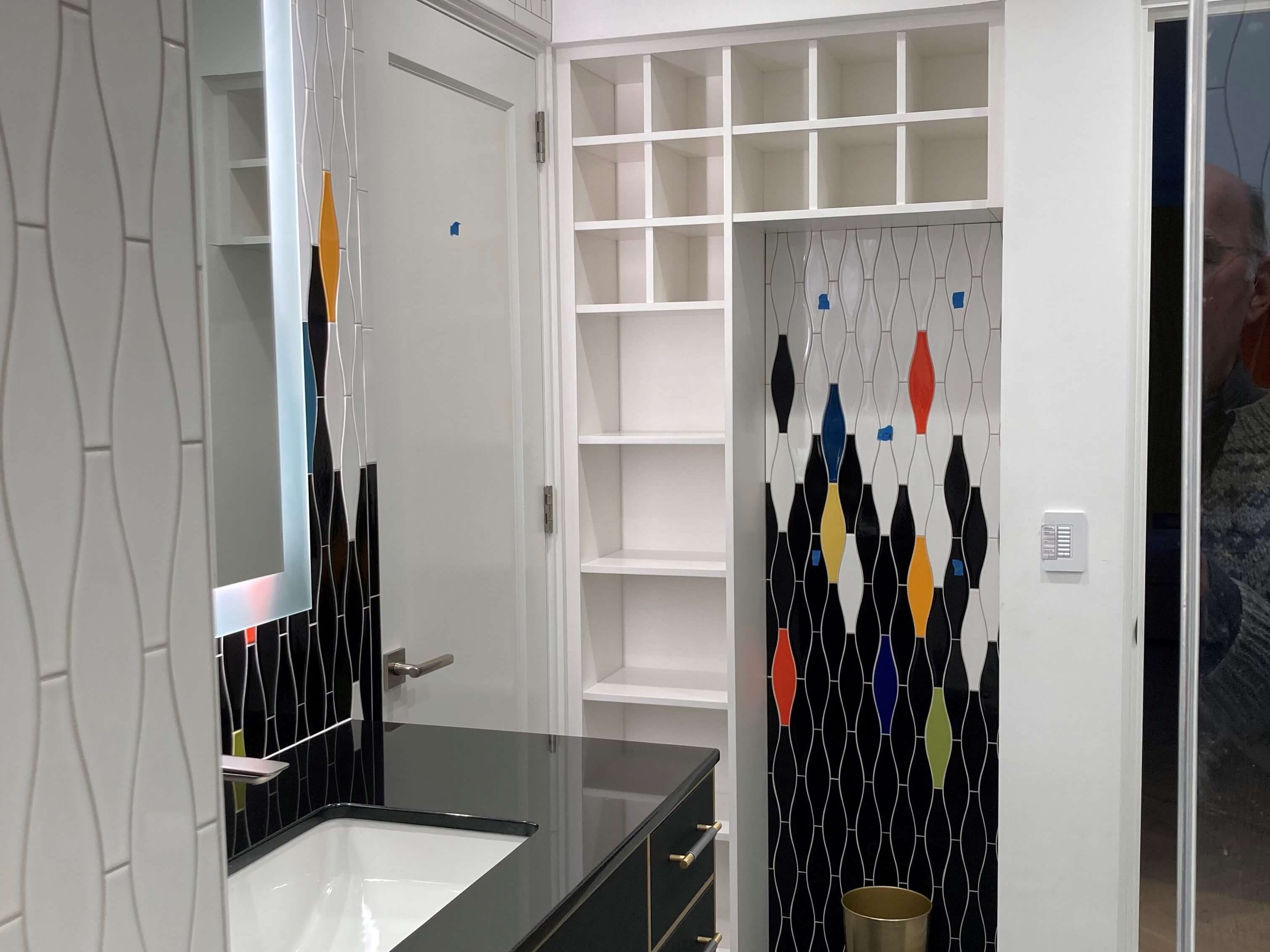 The full bathroom (shown here nearing completion) pulls out all the stops with color and non-repeating tile pattern. It includes a floating vanity done in my “Thin Inset” series for longtime collaborator Premier Custom-Built cabinetry.