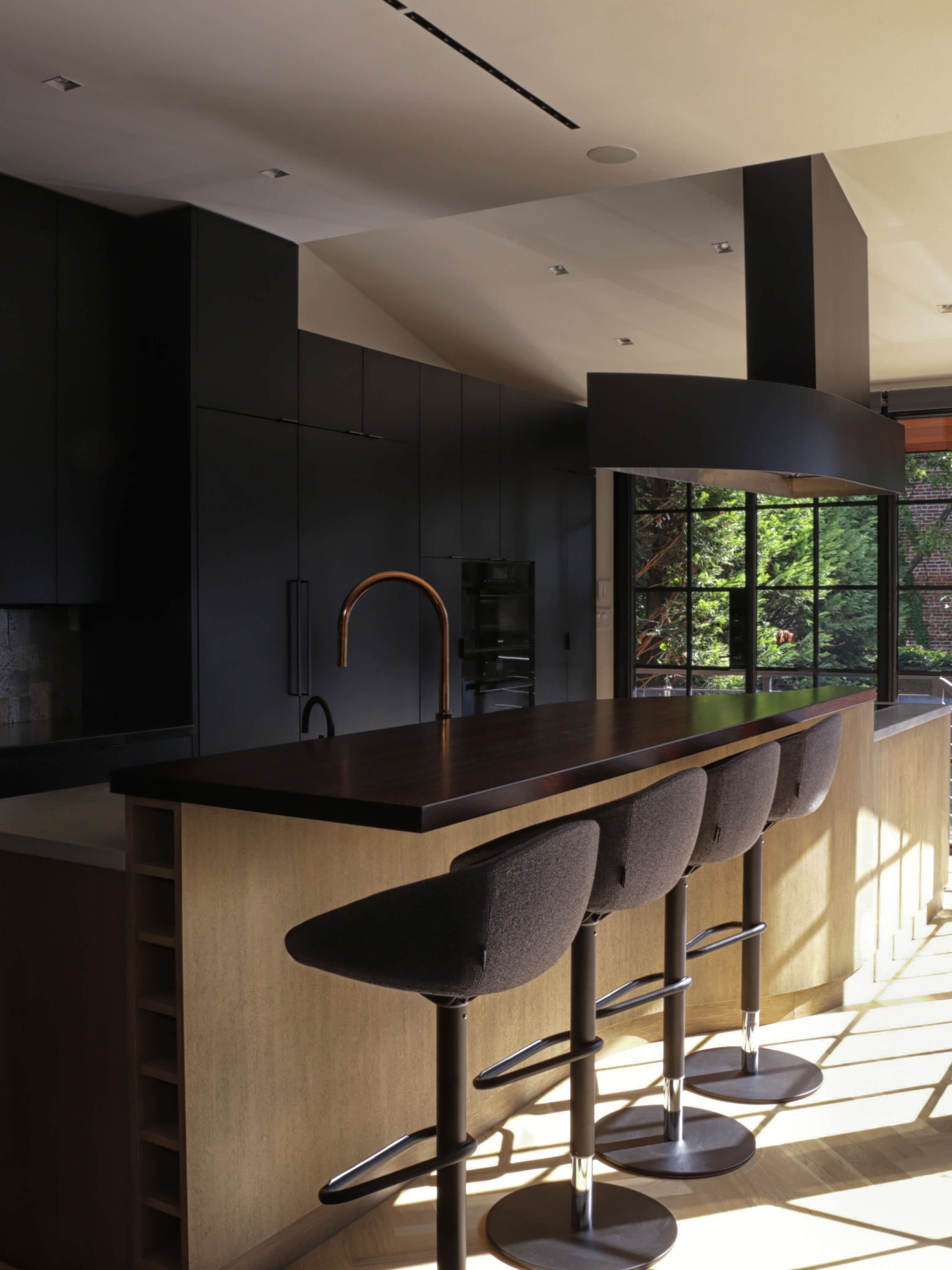 After doing the kitchen and other major spaces on the ground floor of an extensive remodeling project, the client asked me to convert a large finished basement into a multi-purpose recreation space for her teenage daughter, with a young and colorful vibe in contrast with the more quiet and formal character of the rooms upstairs.