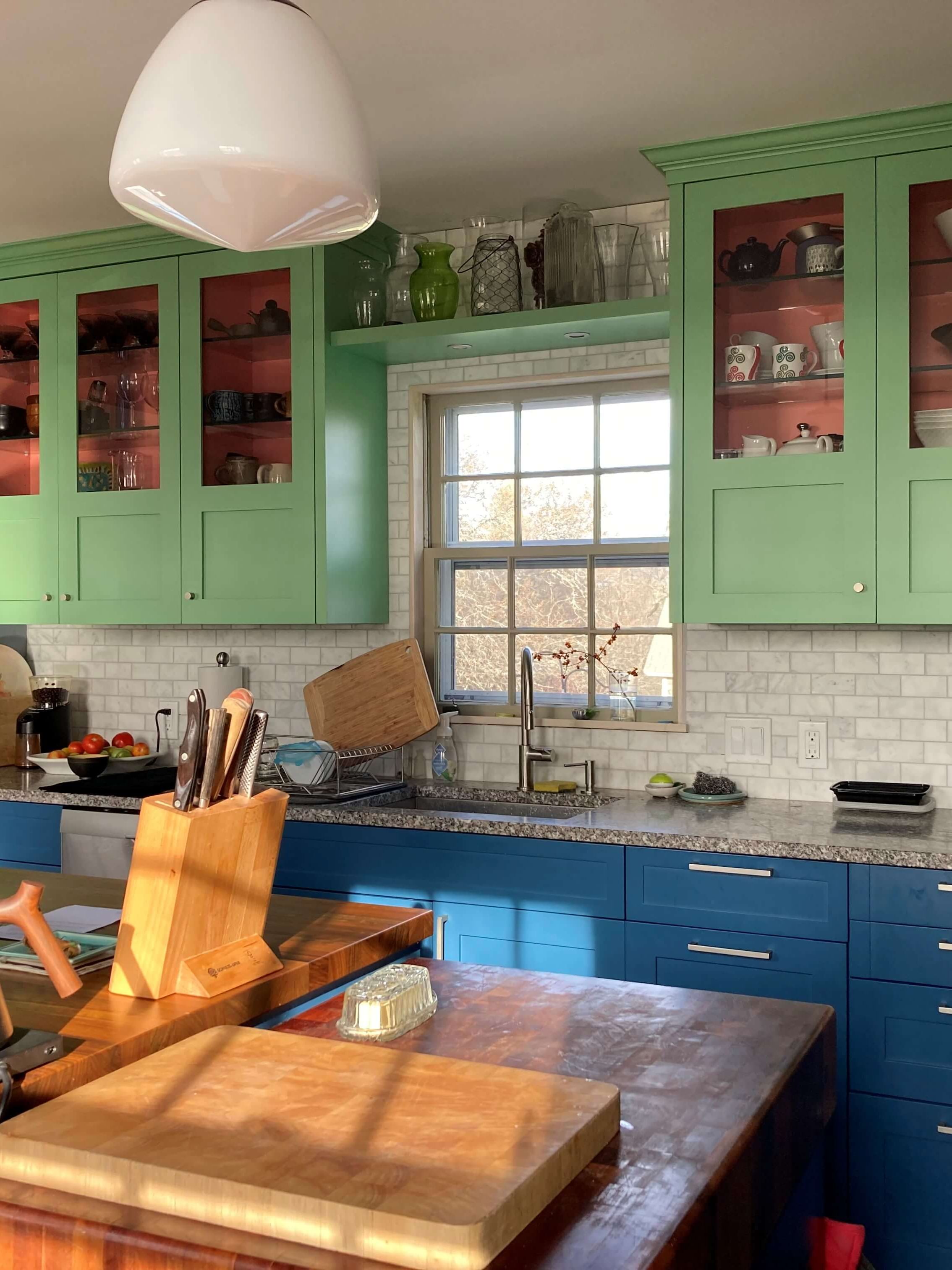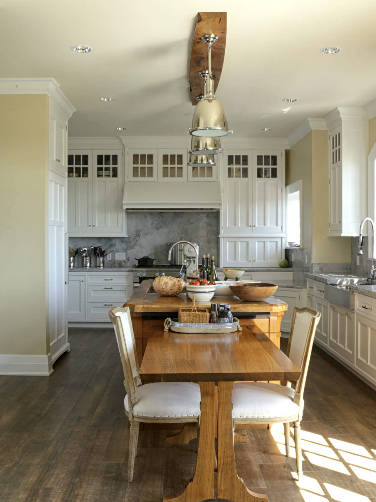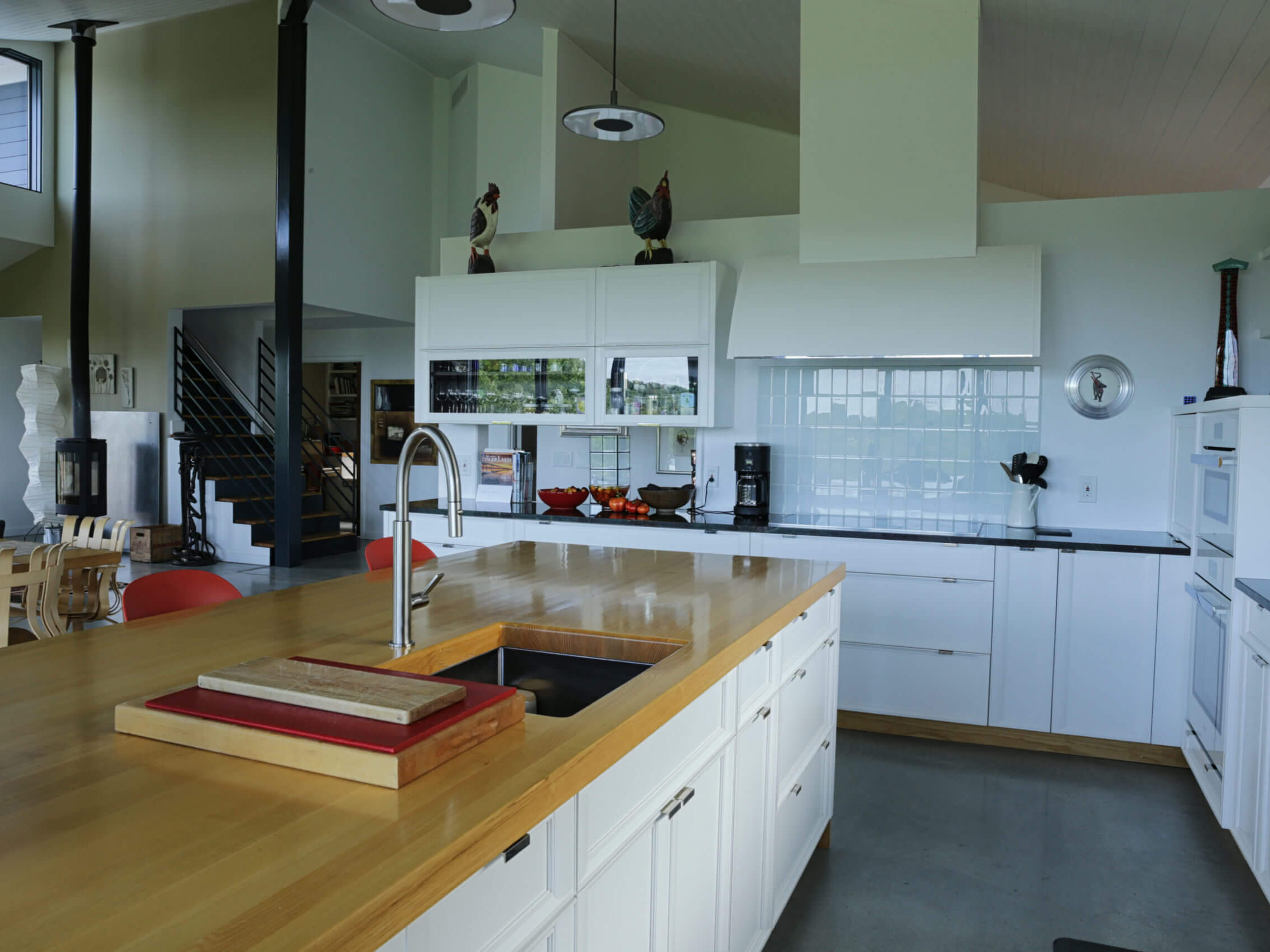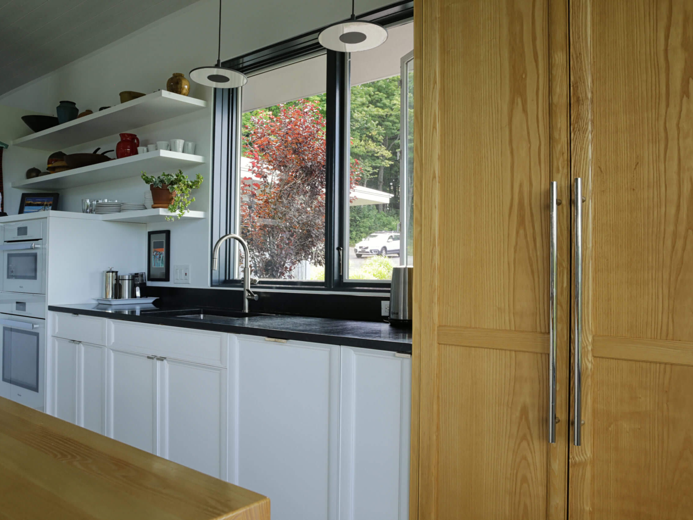 Prairie’s frame and panel door system, unlike most traditional cabinet fronts, uses horizontal and vertical framing members with entirely different profiles, resulting in a dramatic detail where curved and straight sloping elements meet. The visual effect is one of gently undulating movement as the eye follows these contours across an elevation, weaving a dimensional fabric, subtle in its complexity. Thoroughly modern while warm and nuanced, the finished kitchen suits the couple’s casual lifestyle and melds comfortably with the fine art and craft collection of art in their airy home.