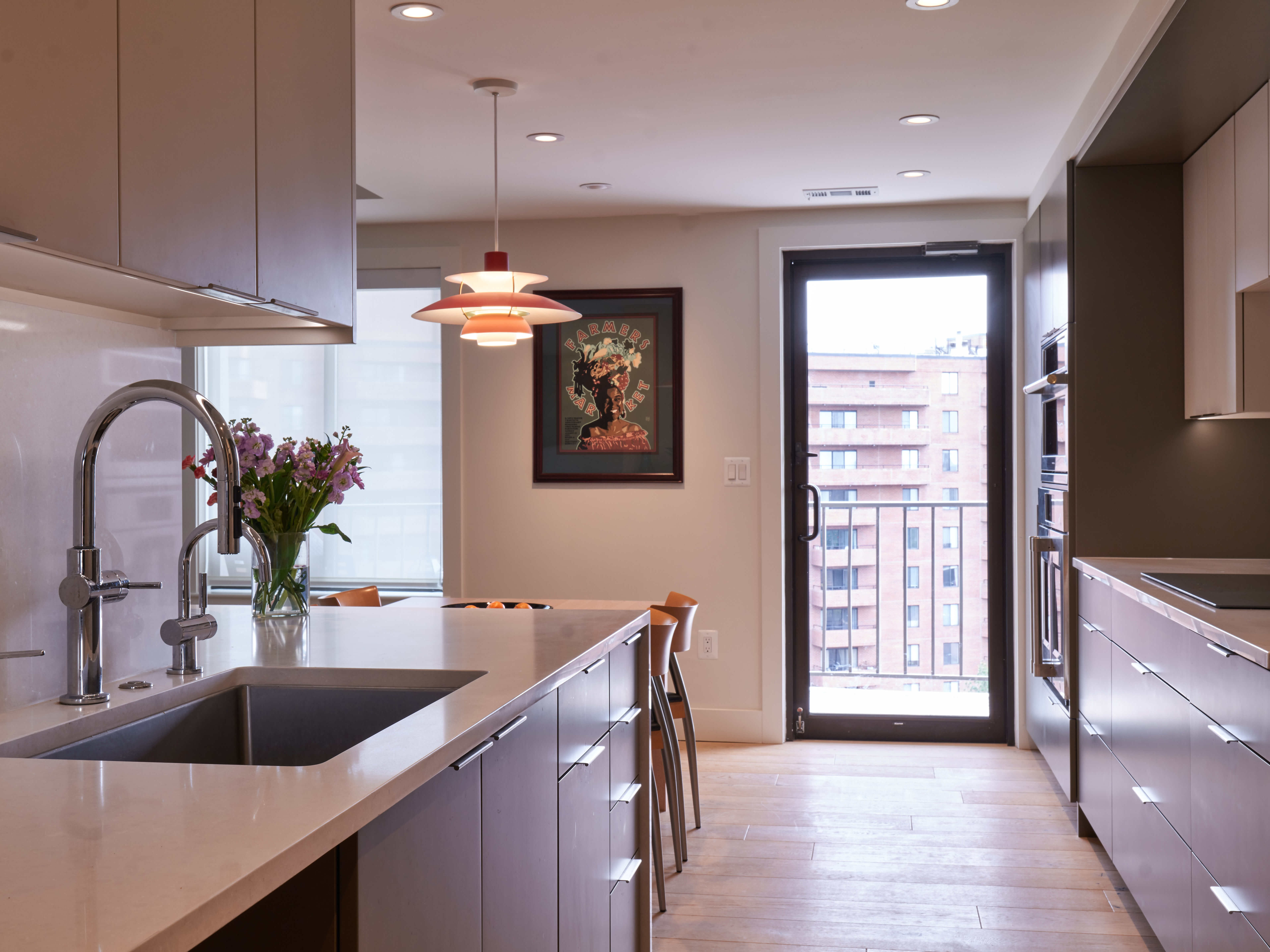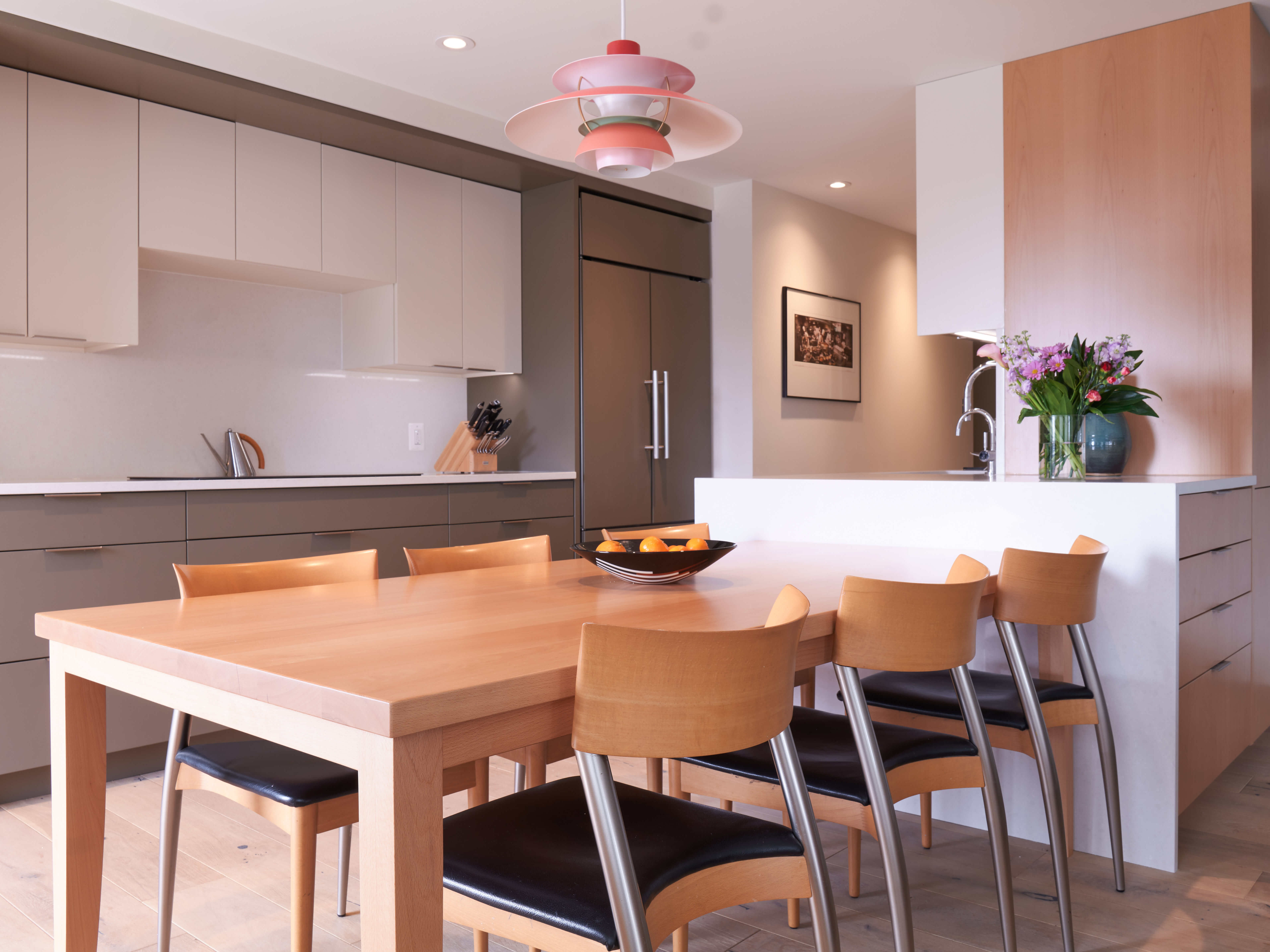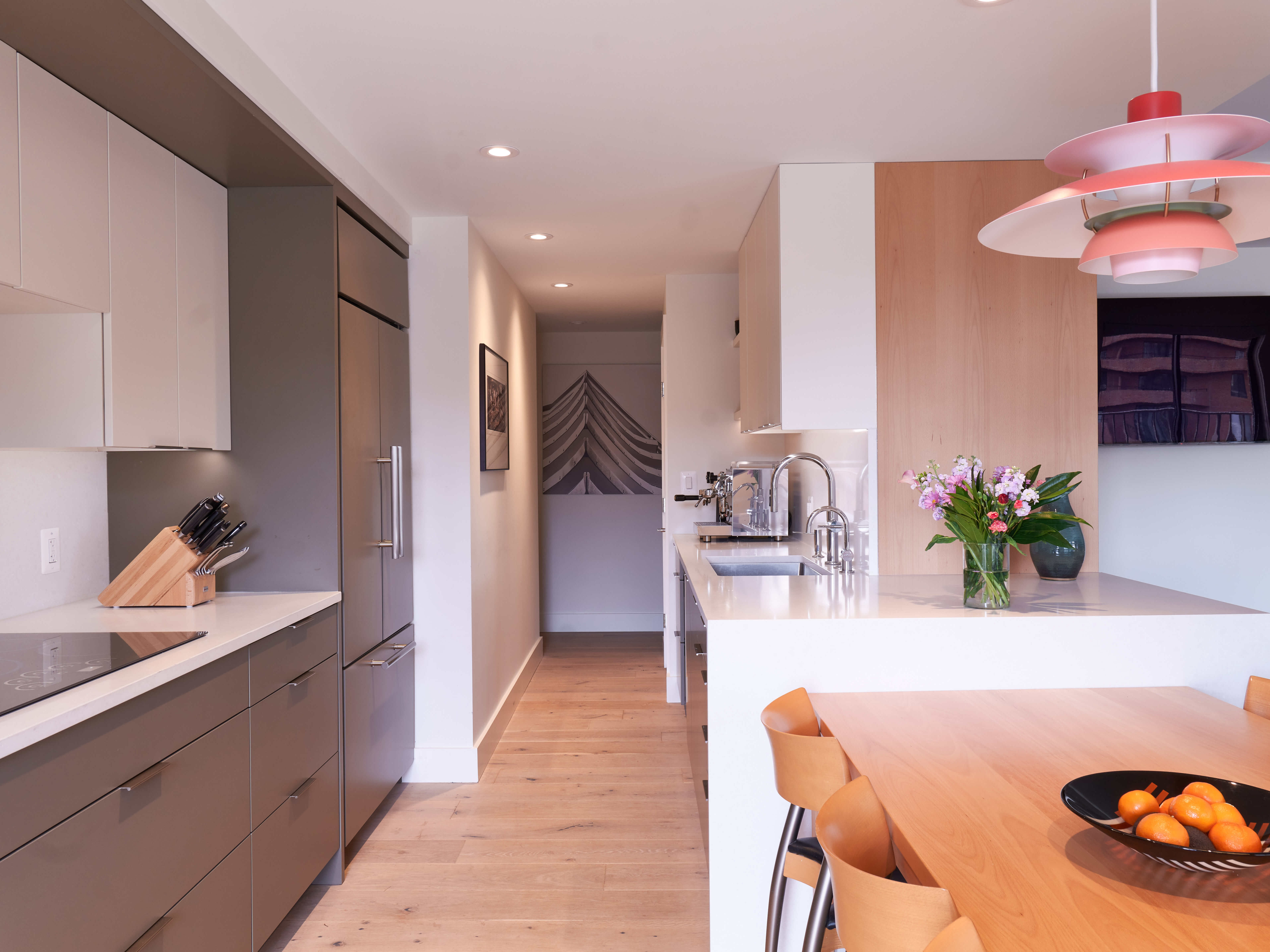 On the tenth floor of a condominium building, with views of the National Cathedral from its wide balcony, this apartment was completely gutted and remodeled, with the kitchen mostly open to living room and dining area. The task here was to work within the architect’s general layout and design language, incorporating already specified appliances into a space that had to serve everyday cooking and dining, generous storage, and elegant entertaining needs. The dark taupe and soft gray cabinets delineate the working kitchen, while European steamed beech delineates the dining and entertainment areas. With sink and walk in pantry tucked behind the floor to ceiling cabinetry that faces the living room, the peninsula and custom dining table create a distinct yet sociable boundary in this warm and inviting modern home.