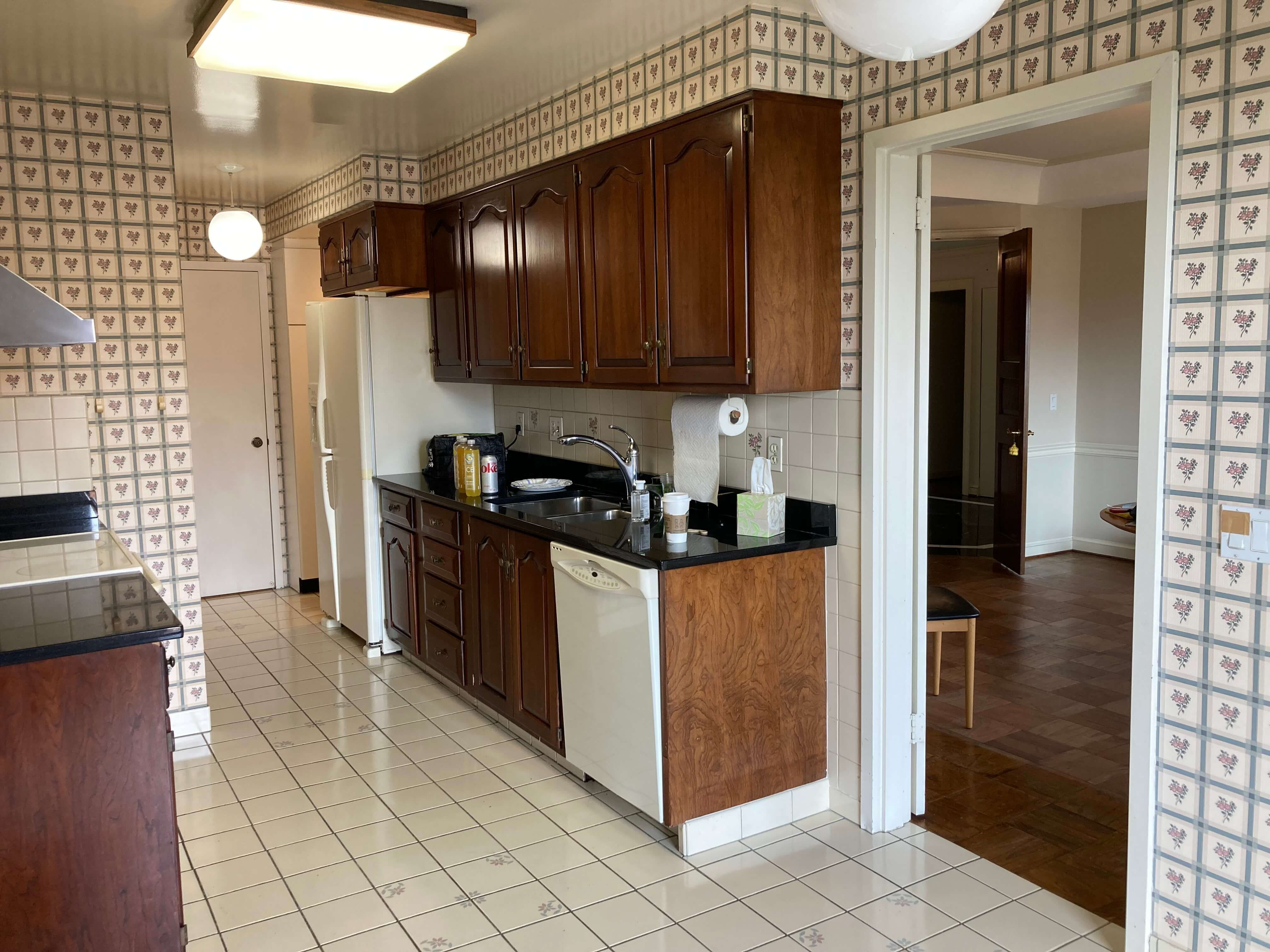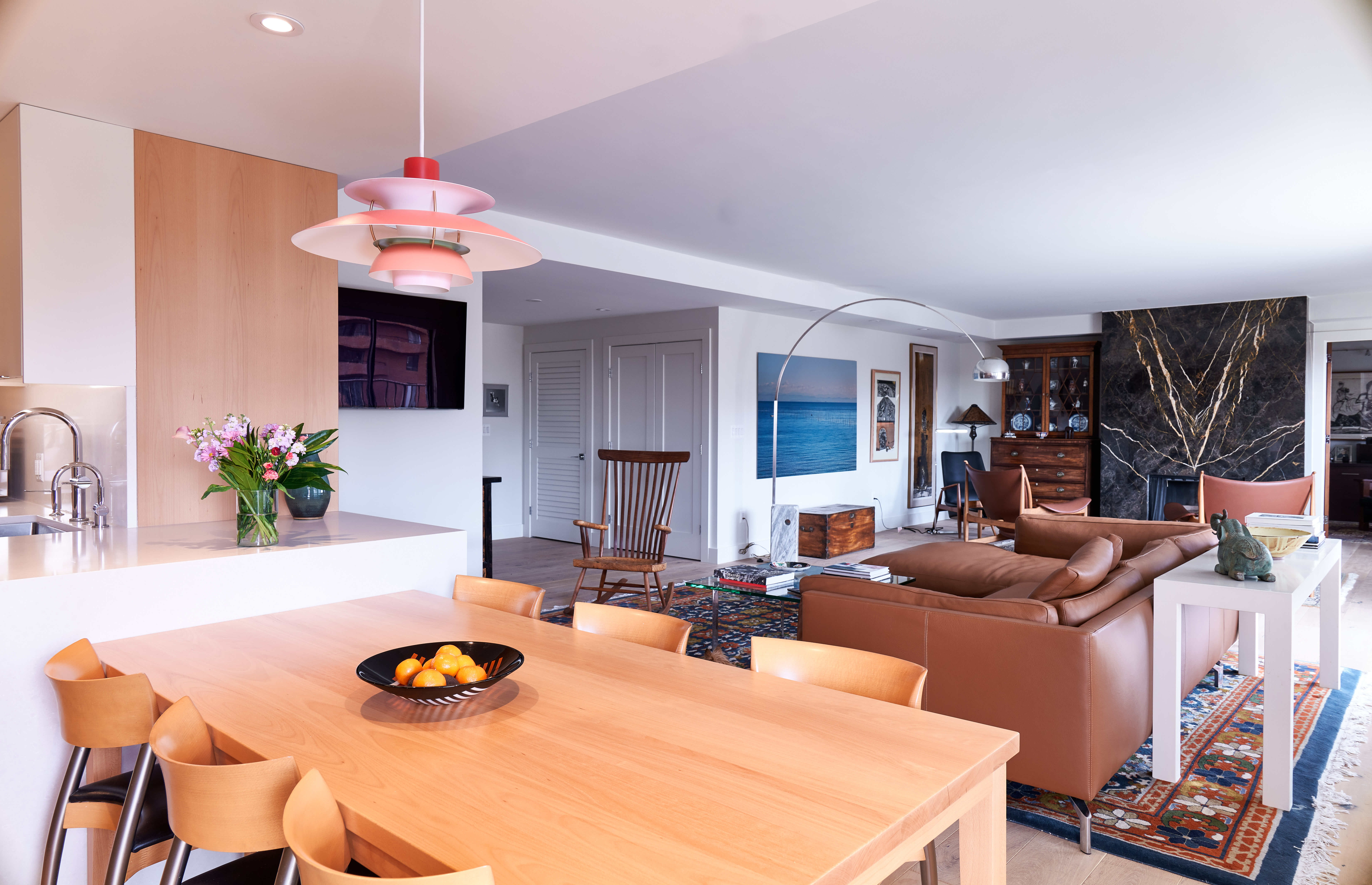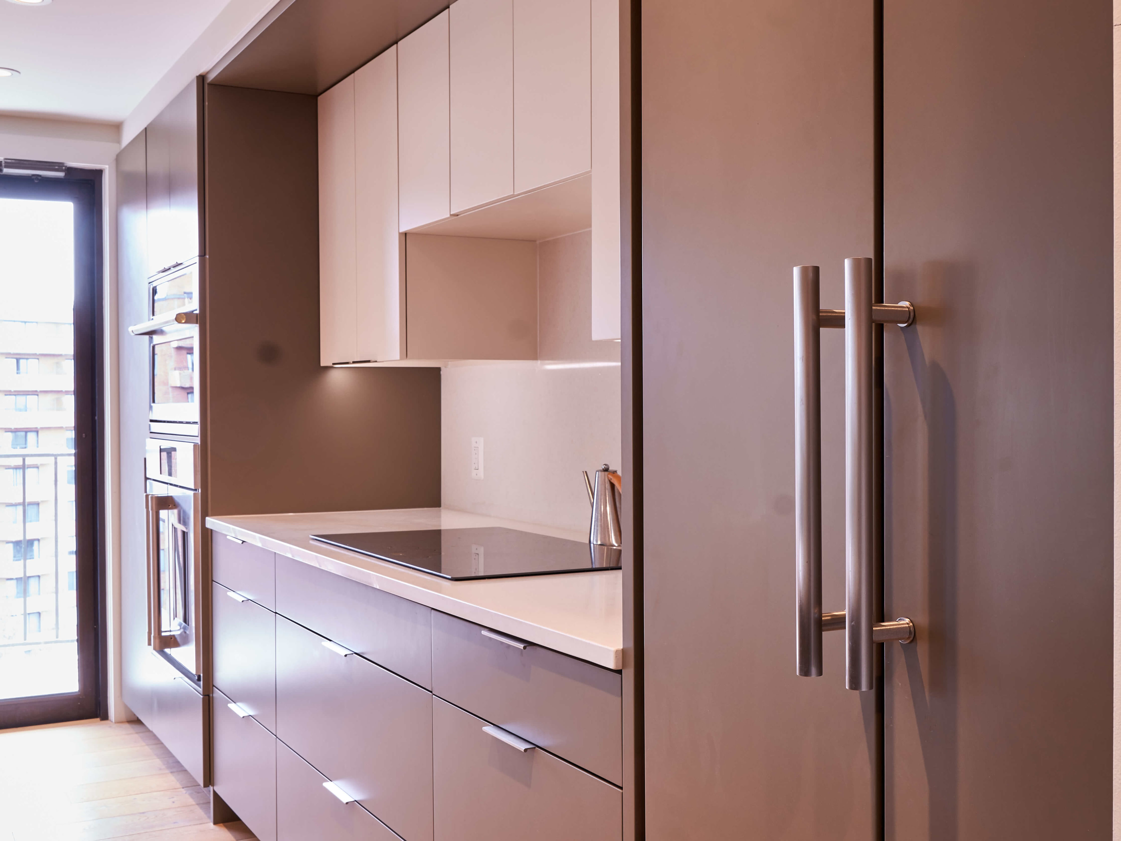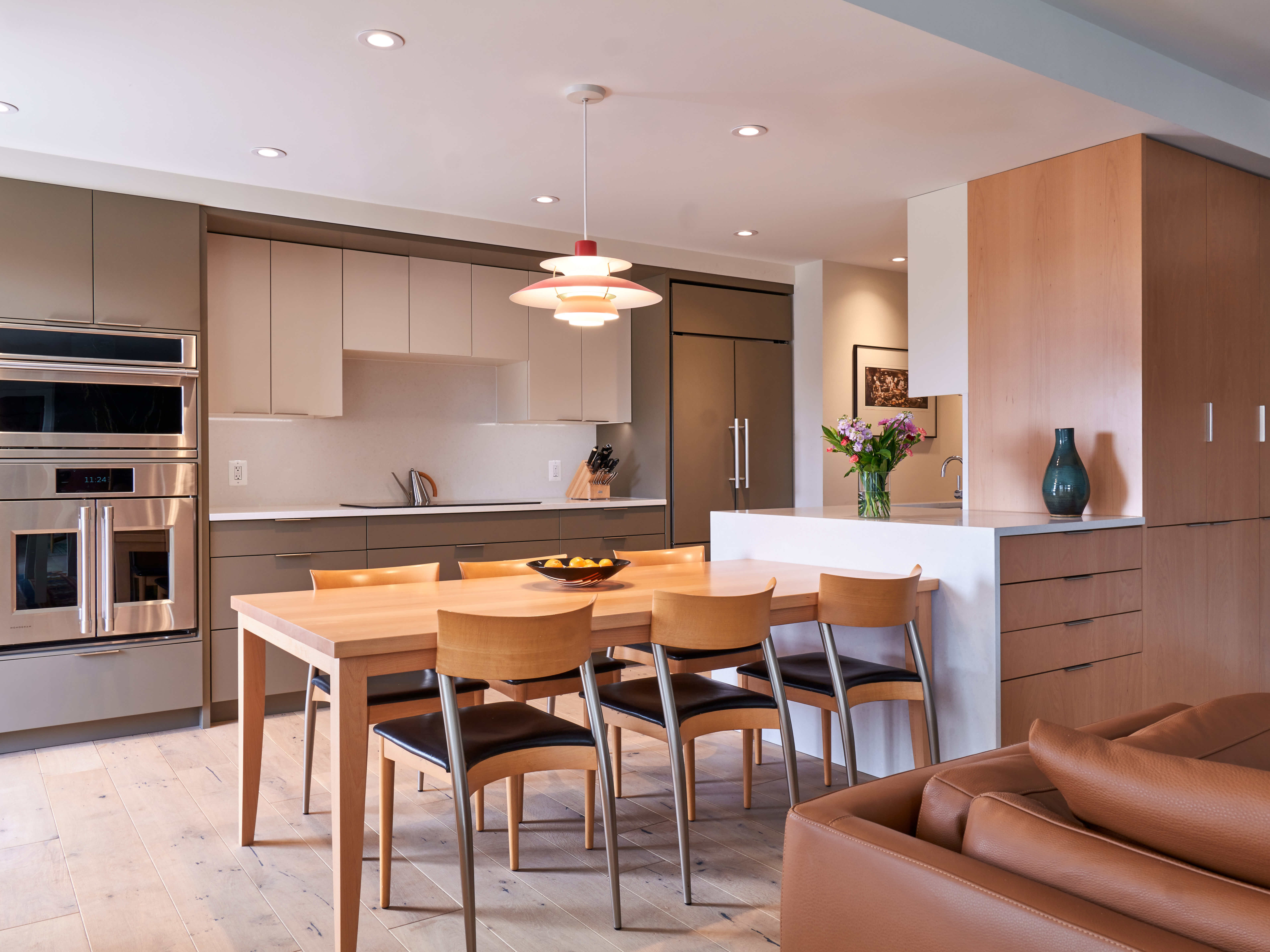 On the tenth floor of a condominium building, with views of the National Cathedral from its wide balcony, this apartment was completely gutted and remodeled, with the kitchen mostly open to living room and dining area. The task here was to work within the architect’s general layout and design language, incorporating already specified appliances into a space that had to serve everyday cooking and dining, generous storage, and elegant entertaining needs. The dark taupe and soft gray cabinets delineate the working kitchen, while European steamed beech delineates the dining and entertainment areas. With sink and walk in pantry tucked behind the floor to ceiling cabinetry that faces the living room, the peninsula and custom dining table create a distinct yet sociable boundary in this warm and inviting modern home.