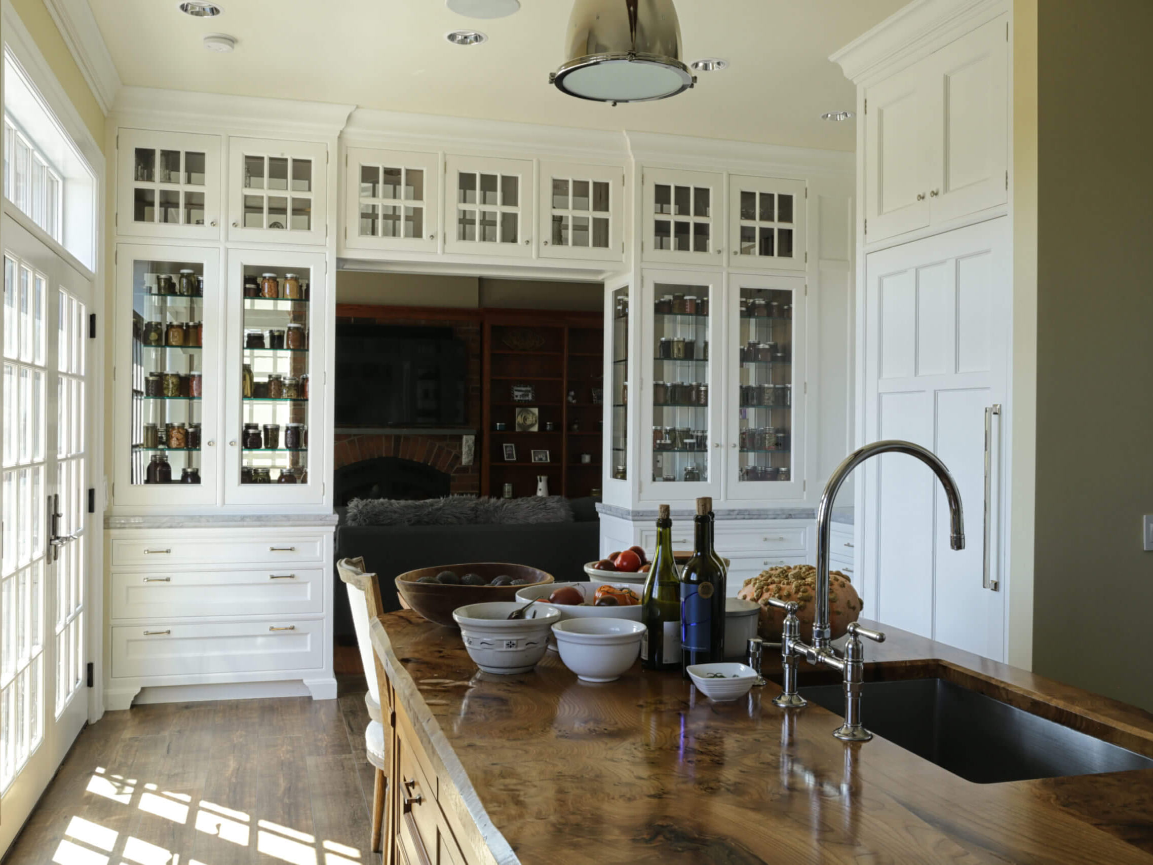 Picking up on the bands of divided light windows used throughout the house, Scott composed a clerestory band of divided lights of exactly the same size, sizing the door panels, cabinet face frames and pilasters to flow rhythmically around the room. Precise proportional relationships between horizontal and vertical elements, inherent in Ruskin, are reinforced by panel groupings, bracketed by strong corners and profile offsets. Faceted corner posts are used instead of Classical pilasters or turnings. The walnut island features a coved upper drawer course and showcases a stunning Witch Elm Burl work top.
